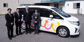 これまでも送迎用の車両はありましたが、運営するA型事業所「サポートセンターあゆみ」に通所する利用者数が順調に増加し、1台での運用に限界を感じていました。このたび日本財団様の福祉車両助成申請が受理され、3月7日(月)に東広島市子育て・障害総合支援センターより奥村和徳センター長(写真右から2人目)と宇根靖夫様(写真右端)をお迎えして車両の贈呈式を執り行い、寄贈を受けた次第です。