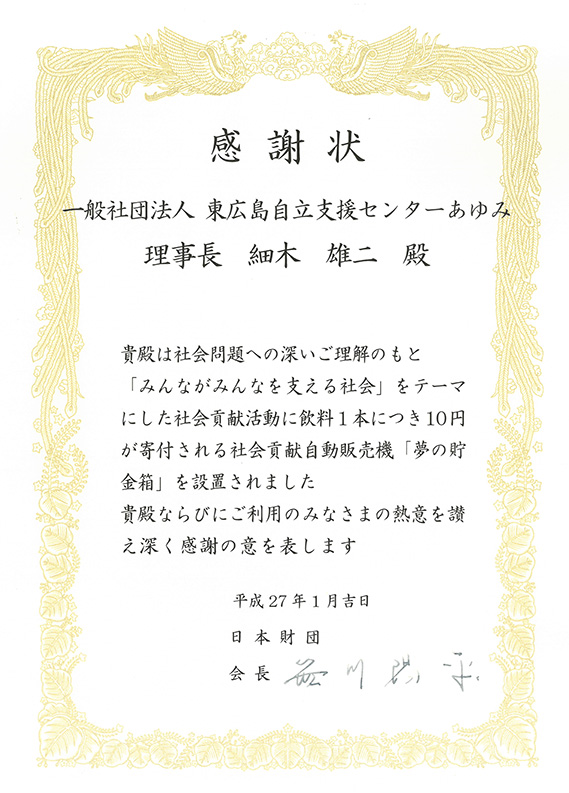 この度、サポートセンターあゆみに飲料1本につき10円が寄付される「夢の貯金箱」という社会貢献自動販売機を設置し、その感謝状をいただきましたのでご紹介します。